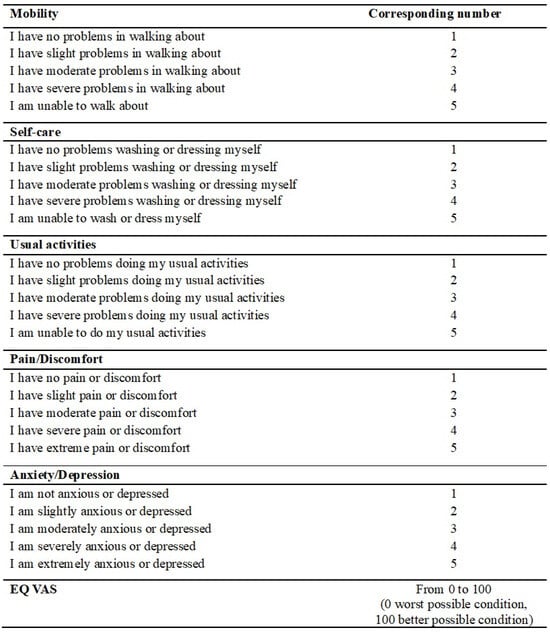 After resection with curative intent, all patients entered the oncological monitoring program starting with chemotherapy when indicated according to institutional guidelines. We visited each patient 30 and 90 days after surgery and recorded postoperative complications according to Clavien–Dindo classification (CD) [25], number of readmissions, timing of chemotherapy initiation, and eventual stoma reversal. Restaging TC or a follow-up TC was carried out yearly and earlier if necessary. According to this, we performed a 1-year follow-up after surgery and reported the timing of chemotherapy initiation, eventual stoma reversal with relative stoma rate, oncological patient conditions (metastasis and recurrence), and survival. We also carried out a 3-year follow-up reporting metastasis rate, local recurrence rate, and overall survival. To each patient, the EQ-5D-5L test was administered to assess the quality of life after surgery; test items are reported in Figure 1 [26].