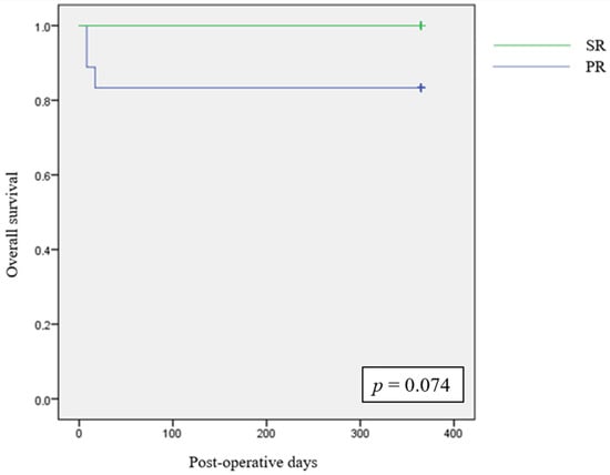 A Clavien–Dindo II complication, pneumonia for one patient and heart failure for another, occurred only in the SR group (5.6%, p = 1), and it required readmission with no significant differences between the two groups (p = 1); no other complications occurred in the two groups.