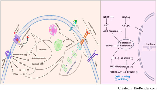 Liver cancer is a global health problem estimated to have more than one million cases worldwide in 2024. Hepatocellular carcinoma (HCC) is the most prominent and is among the leading causes of liver cancer-related death worldwide; it accounts for approximately 92% of all existing cases and relates to liver cirrhosis to a certain extent. Liver cirrhosis directly affects the safety of the treatment and plays a significant role in determining the prognosis of HCC [1,2]. Sorafenib was approved in 2007 for the treatment of advanced HCC, a milestone in the history of HCC treatment. Sorafenib is a preferred treatment for advanced hepatocellular carcinoma (HCC) [3]. This drug has demonstrated the benefit of survival over supportive care in advanced HCC. In the Sorafenib Hepatocellular Carcinoma Evaluation Randomized Protocol (SHARP) trial, 5.5 months (median time to progression) and 10.7 months (survival) were observed in sorafenib-treated patients, compared to a placebo. The absolute improvement in survival was 2.8 months [4,5,6]. Various studies have shown that patients treated with sorafenib have an increased median survival time [7] and an increased resistance level, significantly limiting the efficiency of sorafenib therapy [8]. This is the primary factor causing hindrances in its clinical application. Long noncoding RNAs (LncRNAs) are non-protein-coding ribonucleic acids (RNAs) with more than 200 nucleotides. LncRNAs have been found to play critical roles in developing various cancers, including HCC [9,10]. Although the role of lncRNAs in disease onset has received attention, studies on the relationship between lncRNAs and chemotherapy resistance, especially in sorafenib-resistant HCC, are scarce. The role of lncRNAs in the pathogenesis and progression of various cancers, including hepatocellular carcinoma (HCC), is crucial. These lncRNAs regulate vital processes such as proliferation, migration, apoptosis, autophagy, the cell cycle, tumorigenesis, and metastasis in HCC and related cancers such as renal cell carcinoma (RCC) [11]. Additionally, because the kidney is located near the liver and often plays a compensatory role in liver disease, RCC is also significantly impacted. We will include relevant information on RCC, particularly in the context of sorafenib resistance. A small percentage of patients can get an advantage from sorafenib, and the same proportion of patients commonly acquire drug resistance within a small amount of time [12]. Patients administered with sorafenib usually experience side effects such as gastrointestinal, physical, or skin-related issues (e.g., skin reactions, weight loss, and/or diarrhea) [13,14]. When the effects are severe, sorafenib can cause high blood pressure and/or abdominal pain, which can lead to this drug’s discontinuation [6,15,16]. The mechanisms of sorafenib resistance should be well established. The role of epigenetics, transport processes, regulated cell death, and the tumor microenvironment in the sorafenib resistance in HCC and RCC have been established based on recent studies [17,18,19]. HCC is a unique cancer type; this typically arises in the setting of chronic liver disease at a rate dependent upon the complex interplay of the host of the liver disease and the environmental factors that are responsible [16,20]. The other cause of infection with chronic hepatitis B or C virus is currently the dominant risk factor worldwide for chronic liver diseases after being converted into HCC [20,21]. This review summarizes the mechanisms mentioned above and the role of lncRNA in developing resistance.