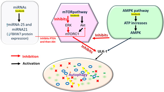Sorafenib induces the AMPK (AMP-activated protein kinase) pathway by increasing the ATP, initiating autophagy via AMPK, and through mTORC1 inhibition or ULK1 activation. Sorafenib can inhibit mTORC1 via the ERK pathway by inhibiting PTEN (Phosphatase and Tensin Homolog), but it can also activate mTORC1 through Akt activation (key regulators of P13K/AKT/mTOR pathway); it also inhibits ERK, further reducing mTOR activity. In addition, miRNAs are involved in sorafenib-mediated autophagy regulation. Sorafenib increases miR-21 and 25 expression, suppressing autophagy and decreasing FBXW7 protein expression, downregulating PTEN expression, and subsequently activating Akt.