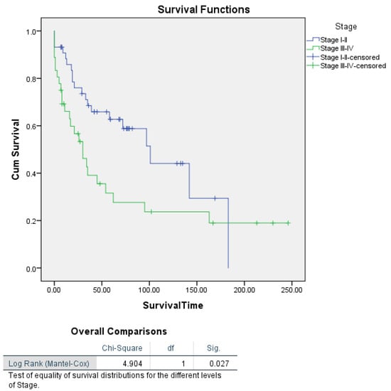 Kaplan–Meier survival curves for patients with uterine carcinosarcoma stratified by tumour stage (Stage I–II vs. Stage III–IV).