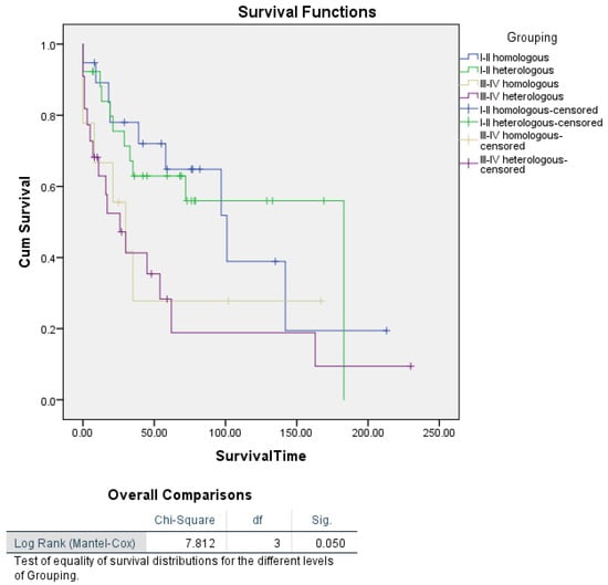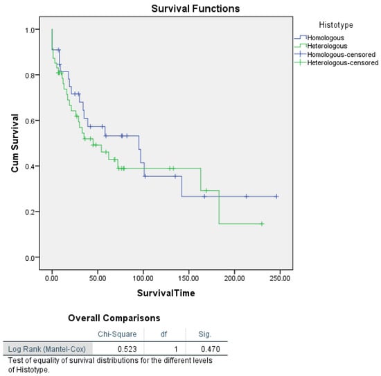 For histotype, Kaplan–Meier survival analysis did not reveal a statistically significant difference (p = 0.470) between homologous and heterologous types of uterine carcinosarcoma (Figure 2).