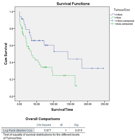 Tumour size also showed a significant association with survival. Kaplan–Meier analyses comparing tumour size categories without stratification by tumour stage revealed a significant difference in survival between patients with tumours larger than 4 cm and those with tumours 4 cm or smaller (log-rank p = 0.015). Patients with tumours > 4 cm had a median survival of 35 months, compared to 142 months for those with tumours ≤ 4 cm, indicating a significant association between tumour size and survival. While tumour size did not remain significant in the multivariate Cox proportional hazards regression, probably influenced by tumour stage, these Kaplan–Meier results emphasize the importance of tumour size as a predictor of survival: its effect is more pronounced when considered alongside tumour stage (Figure 4).