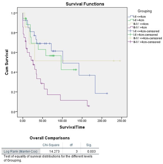 Further Kaplan–Meier analysis stratified by tumour stage revealed a highly significant difference in survival based on tumour size (log-rank p = 0.003), with patients having tumours > 4 cm experiencing markedly poorer survival, particularly in Stage III–IV disease, where their median survival was only 26 months, compared to those with tumours ≤ 4 cm, whose median survival was not reached. Although tumour size was not significant in the multivariate Cox analysis, the Kaplan–Meier results suggest that tumour size remains a crucial predictor of survival, especially when considered in the context of tumour stage (Figure 5).