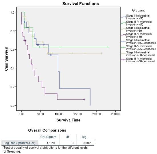 For myometrial invasion alone, Kaplan–Meier survival analysis did not reveal a significant difference in survival between patients with ≤50% invasion and those with >50% invasion (log-rank p = 0.276). However, when stratified by tumour stage, a significant difference in survival was observed (log-rank p = 0.002). Patients with Stage III–IV tumours and myometrial invasion >50% had a median survival of 21 months, compared to Stage I–II patients, where median survival was not reached. These findings suggest that myometrial invasion influences survival primarily in patients with advanced-stage disease (Figure 6 and Figure 7).