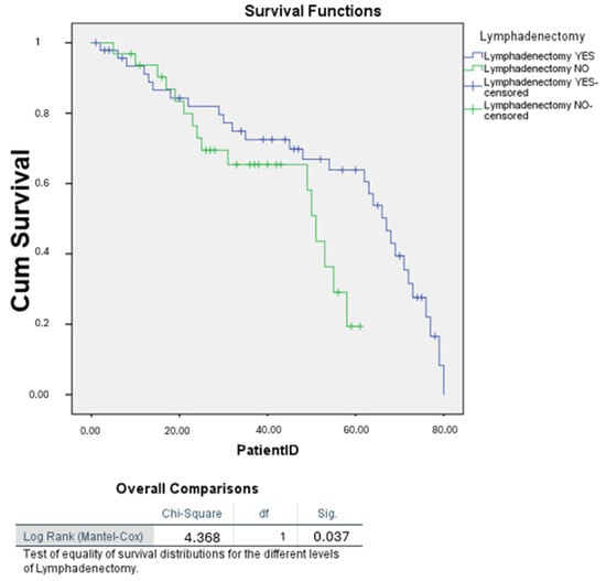 Our Kaplan–Meier analysis revealed a significant association between lymphadenectomy and improved survival outcomes (log-rank p = 0.037), with a median survival of 67 months for patients who underwent lymphadenectomy compared to 51 months for those who did not (Figure 8).