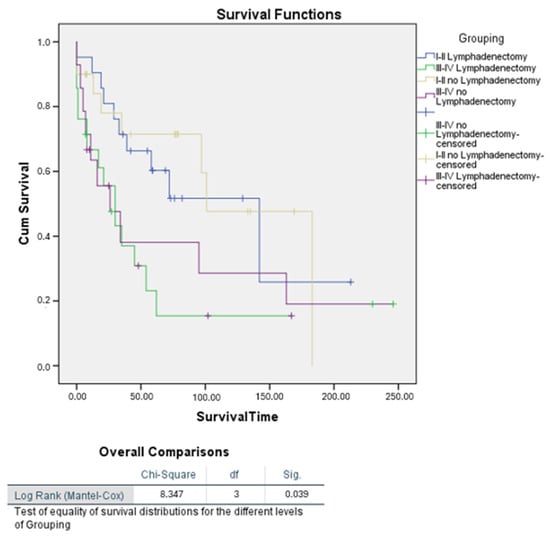 Further Kaplan–Meier survival analysis stratified by tumour stage confirmed a statistically significant difference in survival between patients who underwent lymphadenectomy and those who did not (p = 0.039) (Figure 9).