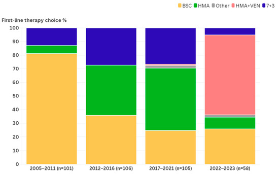 Since an age at diagnosis above 60, and later 65, was considered an eligibility criterion for intensive chemotherapy and HSCT, few patients underwent these trajectories before 2012. With consensus in the field shifting towards a combination of varying fitness criteria replacing age, more patients were recommended the 7+3 regimen. From 2012 onwards, many patients receiving the 7+3 regimen participated in clinical trials [34,41,42]. Parallel to the increased usage of the 7+3 regimen in patients aged 60 and older, HMAs were introduced as a less toxic alternative for first-line induction therapy. These developments coinciding resulted in a stark reduction in the number of patients who could only be offered BSC from 2012 onwards. Although the rate of patients aged 80 and older receiving antileukemic therapy increased considerably with the introduction of HMAs, median OS and rates of 1- and 2-year survival remained poor. Endpoints that were not measured, such as transfusion dependence and quality of life, may have nevertheless been improved in these patients. In the 2016–2021 period, the number of patients not receiving antileukemic therapy reduced to a quarter of diagnoses where it has since remained. By considering more patients as eligible for HMA monotherapy, a further but small increase in life expectancy could be realized. The overall CR/CRi rate of 25% and median OS of 10.0 months represent real-world outcomes for patients on HMA monotherapy [43,44]. Induction with the more intensive DEC10 regimen became an option for somewhat fitter patients who were still deemed ineligible for the 7+3 regimen, contributing to increased remission rates [34].