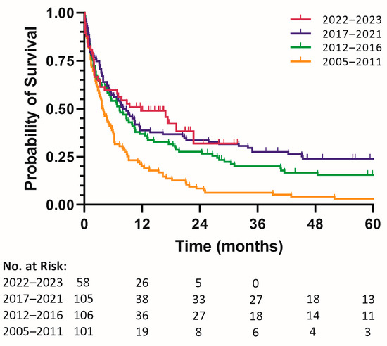 Survival differences between treatment periods, as well as the type of first-line therapy, were estimated using a Cox proportional hazards model. Additionally, survival was visualized using the Kaplan–Meier method, from which median overall survival and 1- and 2-year survival rates were derived. Follow-up was completed up to 31 August 2024, after which censoring was applied. Patients lost to follow-up before that date were censored on the last date they were seen by a healthcare practitioner. The overall follow-up time was estimated using the method of Schemper and Smith [32]. Data were analyzed using the Statistical Package for the Social Sciences from IBM, New York, NY, USA, version 28. A two-sided p-value < 0.05 was used to indicate statistical significance.