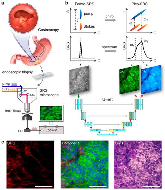 Liu et al. compared picosecond laser-based imaging with single-shot femtosecond SRS (Femto-SRS) and demonstrated that the methodology can reach maximal speed and accuracy by integrating with U-Net [85]. As shown in Figure 2, excised tissues from gastroscopic surger, were placed upon a glass slide and analyzed with an SRS microscope. The speciality of the work was that it could generate highly chemically precise Pico-SRS from Femto-SRS. The basic difference observed between Femto- and Pico-SRS methodologies was that the former, despite having the advantages of high speed and high SNR, is compromised by its weakness in chemical selectivity. While Femto-SRS casts single-shot single channel images, Pico-SRS takes raw images at two Raman frequencies (ω1 = 2845 cm−1 for CH2, ω2 = 2930 cm−1 for CH3) to extract lipid/protein distributions with very high compositional precision. An engineered U-Net was designed to take in the single channel Femto-SRS and split it up into a dual channel Pico-SRS, eliminating the need for complicated optical engineering or physical tuning of detection frequencies, thereby doubling the imaging speed at half of the laser power, while preserving the spatio-chemical information of the image. The U-Net consisted of convolutional layers with five down-sampling layers and five up-sampling layers and a pooling layer in each. Conversion efficiency was confirmed by cross-comparing with originally recorded Pico-SRS images using the same FOV (Figure 2b). As an aid, SHG was used to image collagen fibers. Multi-chemical imaging results of gastric tissues composed of lipid (green), protein (blue) and collagen fibers (red) from the output SRH can be observed in Figure 2c. The originally acquired picosecond SRS images were used as the ground truth for training the U-Net. After U-Net processing into dual-channel SRS images, chemical decomposition was implemented to output images of proteins and lipids by simple linear algebra, and collagen images were sourced from SHG.