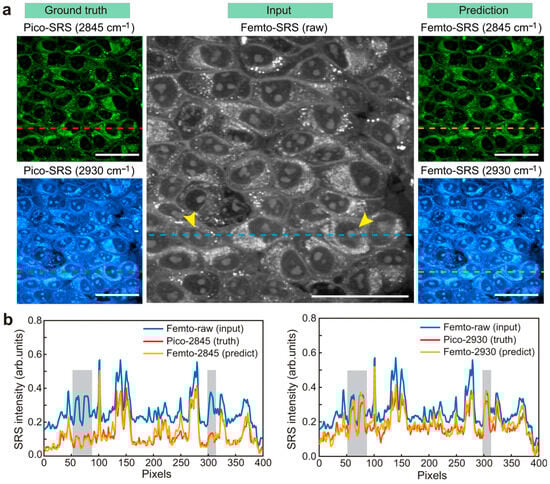 (a) Deep U-Net based Femto-SRS imaging originally acquired Pico-SRS images of two channels (ground truth): the single channel Femto-SRS raw image (input), and the U-Net based prediction. Scale bars: 50 µm. (b) Intensity profiles corresponding to the dashed lines in (a) of the predicted and ground-truth data, showing chemical contrast in the cell nucleus regions (marked in yellow arrows (a) and in grey (b). (Source Liu et al. [85]).