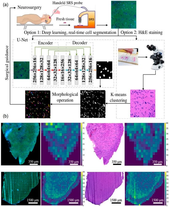 As can be seen, excised tissue samples are extracted intraoperatively and are analyzed using SRS setup. The tissue samples are subjected to U-Net-based split and combine method analysis. The architecture of the U-Net model can be observed in Figure 4a. Cell segmentation involves cropping images into small patches of size 256 × 256 pixels and later combining the segmented patch results, which results in dependable analysis. The U-Net architecture includes an encoder and decoder, where the encoder implements the convolutional process, and decoder applies the deconvolutional process. The U-Net architecture also included 16, 32, 64, 128, and 256 kernels for the encoder and decoder in the five levels, which reduces the model’s complexity and the number of parameters to be optimized. Option 1 involves analyzing the SRH images using the deep learning, real-time U-Net cell segmentation method. For option 2, the study utilized the K-means clustering method, which involves a H&E staining process, making it time-consuming and hence impractical as a quick diagnostic methodology. The K-means clustering methodology is an unsupervised learning algorithm that has the advantages of efficient calculation and better understanding. The objective function of the samples X = {x1, …, xn} used for clustering samples with K clusters is