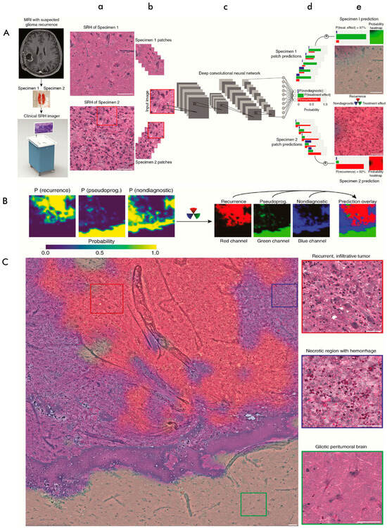 (A) (a–d) The SRH and CNN workflow for the automated detection of recurrent glioma. (a) A 1 × 1-mm SRH image is captured in about 60 s, (b) which gets split into 300 × 300-pixel patches using a dense sliding window method. (c) Each patch is analyzed by a feedforward CNN. (d) The final softmax layer produces a categorical probability distribution across classes: recurrence, pseudo-progression/treatment effect, and nondiagnostic. (e) An aggregation algorithm aggregates patch-level prediction probabilities to yield a single probability of recurrence for each specimen or patient. Scale bars = 50 μm. (B) Probability heatmaps for each of the three output classes are generated using patch-level predictions obtained from a dense, overlapping sliding window algorithm. This method ensures that each pixel in the image has a corresponding probability distribution, resulting in high-resolution, smoother heatmaps. (C) Each heatmap is assigned to an RGB channel, producing an overlay of predictions on the entire SRH slide. An SRH image from a patient with recurrent glioblastoma is shown, where dense tumor areas (red) are highlighted alongside nondiagnostic regions such as hemorrhagic and necrotic tissue (blue) and gliotic brain tissue (green). This semantic segmentation technique enhances the interpretation of SRH images by combining CNN predictions with spatial information about recurrent tumor areas. Scale bars = 50 μm (adopted from Hollon et al. [91]).