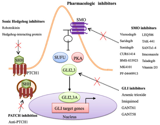 Hedgehog signaling pathway demonstrating pharmacologic inhibitors of the signaling cascade and its molecular targets [25].