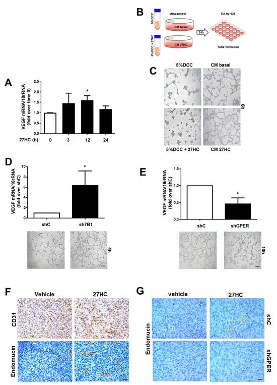 GPR30 is required to promote 27HC-induced angiogenesis in ER−BC cells. (A). QPCR analysis of VEGF in MDA-MB-231 cells treated for the indicated times with 27HC (10−6 M) * p < 0.05 vs. basal (untreated) cells. (B) Graphical protocol used for the preparation of MDA-MB-231 conditioned medium (CM). (C–E) Tube formation in EA.hy926 exposed to conditioned media collected from MDA-MB-231 without (basal) and with 27HC (10−6 M) (C) and from shC, sh7B1 (D) and shGPER (E) * p < 0.05 vs. shC cells. Images were obtained with a 10× objective, scale bar 50 µm. (F,G). Abundance of CD31 and endomucin was evaluated by immunostaining in xenografts tumors of parental (F) or shC and shGPER (G) MDA-MB-231 cells. Images were obtained with a 20× objective, scale bar 25 µm.