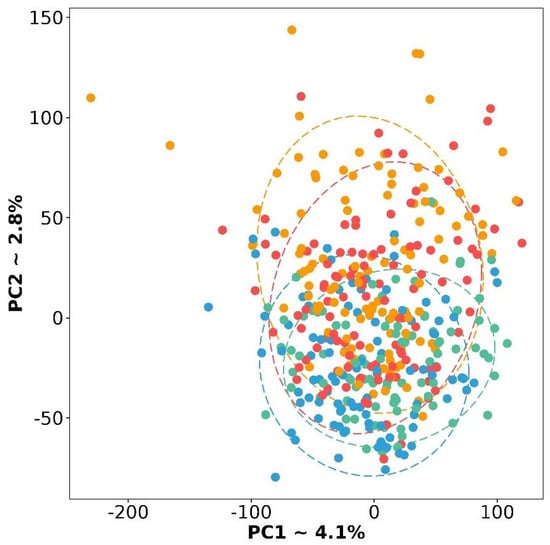 PCA plot based on gene expression for four molecular subtypes of HGSC. Red color is a differentiated subtype, green—immunoreactive, blue—mesenchymal, and yellow—proliferative.