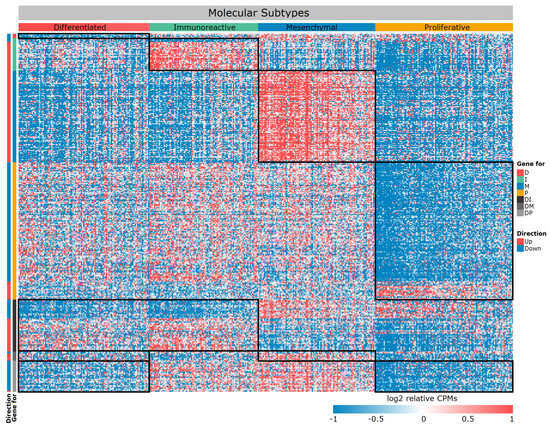 We crossed these lists and obtained 1390 unique DE genes between subtypes. Because we initially assumed to provide a multiplatform for our approach, we have left only those genes from this list that were also expressed in samples from datasets 2–6 (Table 1). Thus, we have formed a list of 357 DE genes, which we have marked up according to the direction of expression change in four subtypes (Table 2, Figure 2, Supplemental Table S3).
