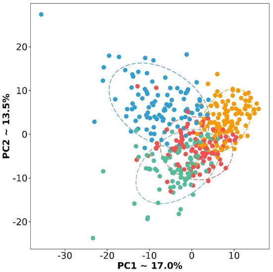 Previously, four molecular subtypes were described: differentiated (D), immunoreactive (I), mesenchymal (M), and proliferative (P) [9]. As a first step of the study, we verified that these molecular subtypes have expression variability on RNA-seq data. To do this, we performed an analysis of the principal components (PCA) and displayed the results in Figure 1. It should be noted that the subtypes really differ from each other, although the differentiated subtype is located at the junction of the other three.