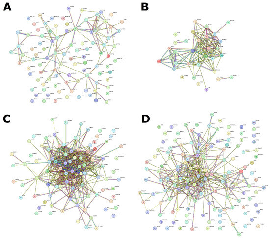 STRING network based on special DE genes for each of four subtypes. (A) D subtype, (B) I subtype, (C) M subtype, and (D) P subtype.