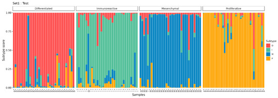 It should be noted that some samples have a mixed signature. For example, when most of the signal is assigned to subtype I, at the same time, the signature of subtype D is also present to a lesser extent (Figure 5). Probably, such samples include areas of the tumor with different signatures and may belong to different subtypes, which is reflected in bulk RNA-seq samples as a proportion of subtype signatures.