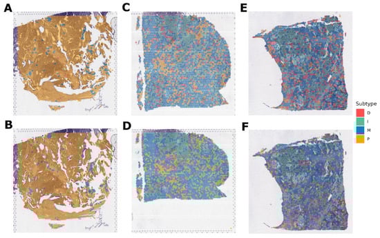 Cohort_4 contained three paired samples (six in total), for which spatial transcriptomics was performed using two different protocols (Figure 6). In this case, the model evaluated small clusters of nearby cells according to the resolution of the sequencing method. As a result, for the Figure 6A,B pair, the subtype is defined as P. For pair Figure 6C,D—M subtype, however, it can be noted that in this sample, there is also a region for which the I subtype is defined. And for the Figure 6E,F pair, the result is not unambiguous. Specifically, for Figure 6E, 38% of the area fell on subtype I and 35% on M. For Figure 6F, it is a little different: 34% is I, and 44% is M subtype. Probably, this sample is represented by two subtypes at once in approximately equal ratio. For this pair, there are also regions with a D signature, but there are much fewer of them.