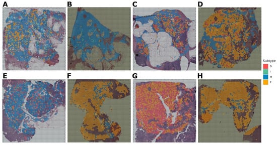 Molecular subtypes of Cohort_4 samples for which gene expression was obtained by spatial transcriptomics. (A,B) pair are replicas of the same tumor slide belonging to the P subtype. (C,D) pair are replicas of one tumor slide, belonging mainly to the M subtype. (E,F) pair are replicas of one tumor slide, belonging mainly to the I and M subtypes.Cohort_5 contained eight samples, for which spatial transcriptomics was also performed (Figure 7). The subtype M was determined for four samples (Figure 7A–C,E) and P for three of the eight samples (Figure 7D,F,H). However, for sample D, it should be noted that in addition to the subtype P, there is an area of subtype M. And one sample (Figure 7G) is assigned to the D subtype, but with a significant interspersing of the P signal.