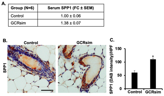 - Kumar, K.; Moon, B.H.; Datta, K.; Fornace, A.J.; Suman, S. Simulated galactic cosmic radiation (GCR)-induced expression of Spp1 coincide with mammary ductal cell proliferation and preneoplastic changes in ApcMin/+ mouse. Life Sci. Space Res. 2023, 36, 116–122. [Google Scholar] [CrossRef]