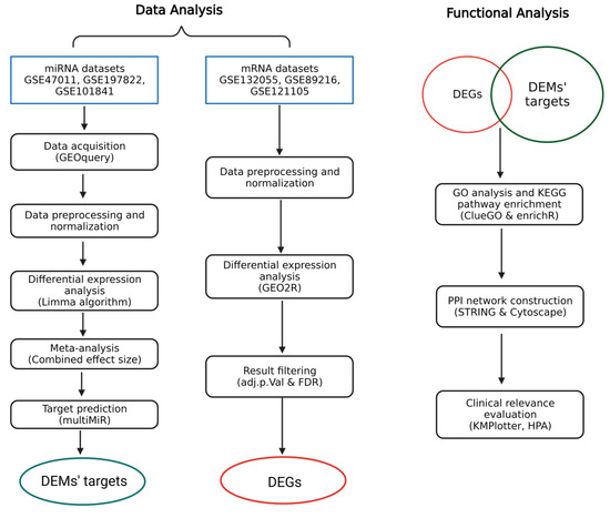 - Ru, Y.; Kechris, K.J.; Tabakoff, B.; Hoffman, P.; Radcliffe, R.A.; Bowler, R.; Mahaffey, S.; Rossi, S.; Calin, G.A.; Calin, G.A.; et al. The multiMiR R package and database: Integration of microRNA-target interactions along with their disease and drug associations. Nucleic Acids Res. 2014, 42, e133. [Google Scholar] [CrossRef] [PubMed]