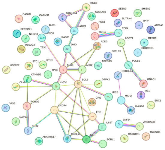 - Szklarczyk, D.; Gable, A.L.; Nastou, K.C.; Lyon, D.; Kirsch, R.; Pyysalo, S.; Doncheva, N.T.; Legeay, M.; Fang, T.; Bork, P.; et al. The STRING database in 2021: Customizable protein-protein networks, and functional characterization of user-uploaded gene/measurement sets. Nucleic Acids Res. 2021, 49, D605–D612. [Google Scholar] [CrossRef] [PubMed]