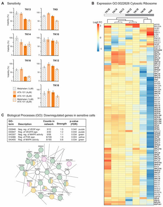 Sensitive TK cells have elevated expression of genes involved in translation (A) Viability measured by the MTT assay relative to untreated control presented for TK9, 10, 12, 13, 14, 16 and 18 cell lines on day 4 after treatment with ATX-101 (4 or 8 µM), melphalan (1 µM) and the combination of ATX-101 (8 µM) and melphalan. The average of 6 replicate wells from one representative out of two repeated experiments is shown. (B) Expression of genes in GO:0022626, cytosolic ribosome and cluster analysis for TK9, 10, 12, 13, 14, 16 and 18. Bolded italic genes have increased expression in TK13 and TK14 compared to TK12. (C) Selected biological processes (GO) of genes downregulated in sensitive (TK13, 14 and 16) relative to not sensitive (TK9, 10, 12 and 18) cells. GO network analysis revealed networks with 153 nodes/126 edges and a PPI enrichment p-value of 1.08 × 10–9. A subnetwork where proteins in VEGF (purple)/MAPK (green) and PI3K (yellow) signalling pathways is shown.