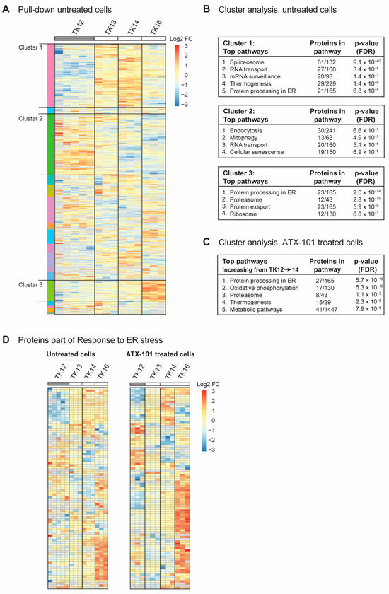 Sensitivity to ATX-101 increases with increasing ER stress. (A) Hierarchical clustering of all quantified protein groups in controls (untreated) TK12, 13, 14 and 16 cells. Cell line over grey box is less sensitive to ATX-101. (B) Top KEGG pathways enriched in clusters 1, 2 and 3 shown in (A), identified by STRING GO analysis. (C) Top KEGG pathways found in the only cluster (same analysis as in (A)) with increasing pull-down of proteins from TK12-16- in ATX-101-treated cells. (D) Cluster analysis of all proteins in untreated and ATX-101-treated cells belonging to GO:003476, response to ER stress. Same heat maps with protein identifications are shown in Supplementary Figure S3. Data from 3–5 independent biological replica are shown.
