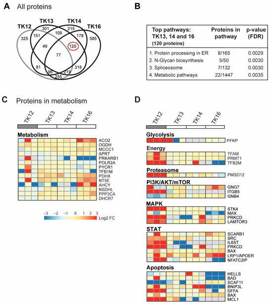 In Figure 3D, all proteins in the GO group “response to ER stress” that changed after ATX-101 treatment in all three biological replicates of each cell line are included. Next, we analysed only the 900 proteins that changed in the same direction (up or down) in all three independent biological experiments (defined as significantly changed) following ATX-101 treatment compared to their untreated control. Although TK12, 13 and 14 were from the same patient, TK12 (the least sensitive) and TK16 (the most sensitive and from a different patient) have more changed proteins in common than any of the other cell line pairs. Changed levels of 77 proteins were detected in all cell lines after ATX-101 treatment, while 120 proteins were changed only in the sensitive cell lines TK13, 14 and 16 (Figure 4A, marked with red circle).