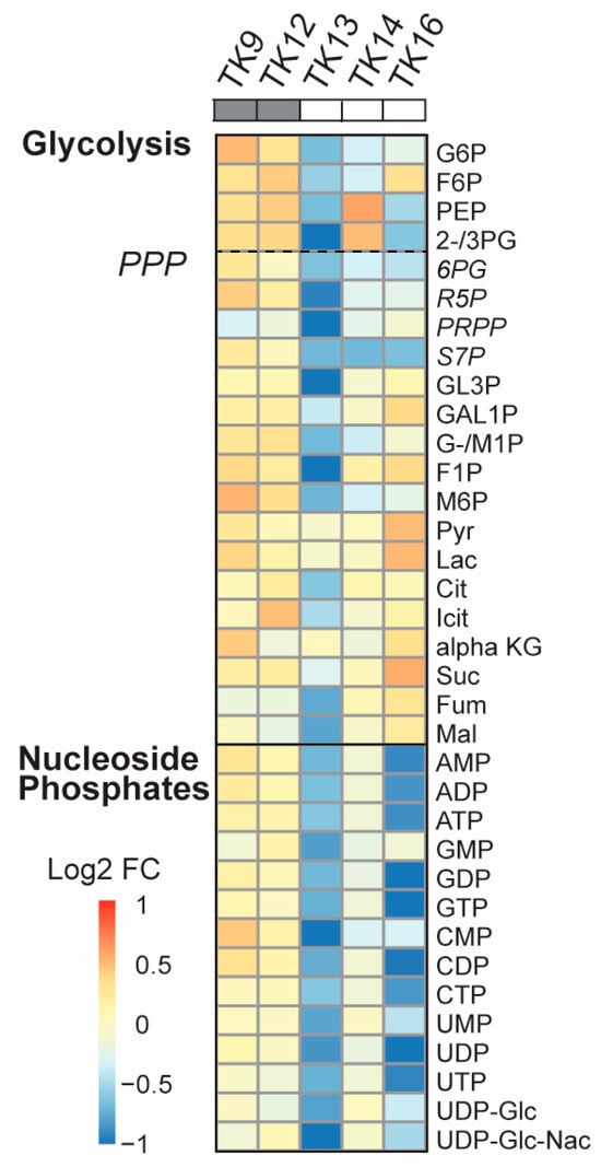 Data has indicated that the UPR is linked to metabolic reprogramming via activation of PDK1 and promotion of aerobic glycolysis [53]. Because we previously observe a “metabolic shift” with reduced metabolite pools in JJN3 and other haematological cell lines upon ATX-101 treatment [6], we next measured how ATX-101 treatment affected the metabolite pools in glycolysis, the PPP and the nucleoside phosphates in the TK cells. A metabolic shift was found in TK13-16 but not in TK9 and TK12 (Figure 5). That TK12 is less affected than TK13 and 14 indicates that the metabolic response to ATX-101 correlates with the sensitivity and not with the origin/genetic background of the cells. Previously, a metabolic shift following ATX-101 treatment was found in LPS-stimulated but not in unstimulated monocytes from the same donor [6]; thus, this suggests that the overall stress/activation level of the cells is important for ATX-101 activity. When ATX-101 was combined with the “stress inducer” melphalan, we detected a shift in the metabolite pools also in TK12 and TK18 cells; however, there was still not a shift in TK9 and TK10 cells (Supplementary Figure S4).