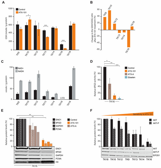 The GSH/GSSG ratio is reduced after ATX-101 treatment in the TK cell lines that also respond to treatment with a metabolic shift. (A) Intracellular GSH levels (nmol/g protein) in untreated and ATX-101-treated (10 µM, 4 h) TK cell lines. Mean ± SD from three replicate cultures. (B) Change relative to untreated control (%) in GSH/GSSH ratio in ATX-101 treated (10 µM, 4 h) TK cell lines. Mean from three replicate cultures. (C) Endogenous intracellular NAD+ and NADH levels (nmol/g protein) in TK cell lines. Mean ± SD from three replicate cultures. TK16 levels < limit of quantification (LOQ). (D) 6PGD activity in TK16 cells treated with ATX-101 (orange, 10 µM), ATX-A (brown, 10 µM) or the 6PGD-inhibitor ebselen (blue, 30 µM) for 4 h relative to activity in untreated control cells. Data displayed are mean ± SD (n = 3). (E) Protein levels of ENO1, 6PGD, GAPDH and PCNA in TK16 cells treated with ATX-101 (orange, 10 µM) or ATX-A (brown, 10 µM) for 24 h. Protein levels are normalised against H3 levels and relative to protein levels in untreated control cells. Data are displayed as mean ± SD (n = 3, ENO1 and 6PGD) or just mean (n = 2, GAPDH and PCNA). Representative Western blots are shown below the bars. (F) Protein levels of AKT and AKT-p in the panel of untreated TK cell lines arranged by increase in sensitivity towards ATX-101. Proteins are normalised to EIF2S1 levels and presented as relative to TK18 levels as mean ± SD (n = 3). * p < 0.05, ** p < 0.01, *** p < 0.001, unpaired two-tailed Student t-test. Representative Western blots are shown below the bars. Raw data and intensity measurements of Western blots in (E) and (F) are shown in Supplementary Figures S8 and S9, respectively.