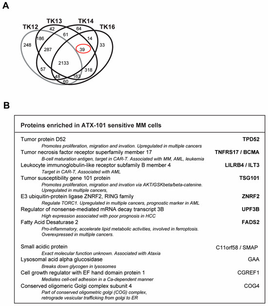 Potential biomarkers for ATX-101-sensitive MM cells. (A) Venn diagram of proteins pulled down from untreated TK12, TK13, TK14 and TK16 cell extracts using the MIB assay. Only proteins that are significantly changed from untreated control (similar change in extracts from all three repeated experiments, Wilcoxon sign rank test) are shown. Full data set is deposit in PXD033510. (B) Proteins out of the 39 proteins marked with red ring in A which are also detected in JJN3 but not in MCCAR, NB4, HL60, primary human monocytes from three donors [6], PXD028314, PXD017474), UmUc-3, T24 ([5] PXD011044), U2OS, H460, A549 [30] (PXD005286) or TK9 (PXD033531). Only proteins that are significantly changed from untreated control (similar change in extracts from all three repeated experiments, Wilcoxon sign rank test) are included.