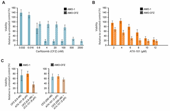 Proteasome inhibitor-resistant MM cells remain sensitive to ATX-101. Dose response of carfilzomib (0.032 to 2500 nM, blue) (A) and ATX-101 (2–12 μM, orange), (B) in sensitive (AMO-1, blank) and carfilzomib (CFZ)-resistant (AMO-CFZ, diagonal stripes) AMO-1 cells. (C) Single agent and combination treatments of CFZ and ATX-101; 0.8 nM CFZ and 6 μM ATX-101 on AMO-1 ((left) panel) and 250 nM CFZ and 2 μM ATX-101 on AMO-CFZ cells ((right) panel). All data presented are from the PrestoBlue assay on day 4 after treatment. The average of 4–6 replicate wells from one representative out of two repeated experiments is shown. Data are normalised to untreated control.