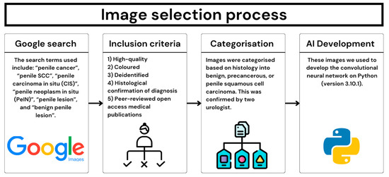 A search was performed on Google Images (Alphabet Inc., Mountain View, CA, USA) to identify images of penile lesions from peer-reviewed open access medical publications. The search terms used include: “penile cancer, “penile SCC”, “penile carcinoma in situ (CIS)”, “penile neoplasm in situ (PeIN)”, “penile lesion”, and “benign penile lesion”. The inclusion criteria are that the images had to be high-quality, coloured, deidentified, and focusing only on the penile lesion (See Figure 1). Images were excluded if they were poor-quality (such as pixelated) or if there was no histological confirmation of diagnosis. The images were then categorised and labelled into benign, precancerous, or penile SCC. Pre-cancerous penile lesions were defined as Bowen’s Disease, PeIN, and CIS. For the images to be included as precancerous or penile SCC, the penile lesion needed to have a histologically confirmed diagnosis. Two urologists who specialise in the management of penile cancer, independently reviewed the images to ensure they met the inclusion criteria and that the images had been appropriately labelled and categorised. These final included images from the dataset.