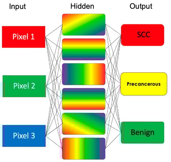 Python (version 3.10.1, Python Software Foundation, Wilmington, DE, USA) was used to develop the CNN-based algorithm and to evaluate diagnostic performance (Area Under the Receiver Operating Characteristic Curve (AUROC), sensitivity, specificity, Positive Predictive Value (PPV), and Negative Predictive Value (NPV)). The CNN automatically extracts and segments the image into pixels in the input layer (see Figure 2). In the hidden layer, the CNN utilises pixel edge contours to generate a “mask” representation of the lesion against normal skin, capturing features such as lesion elevation, erythema, ulceration, redness, and irregularity. Internal validation was performed to evaluate the algorithm’s accuracy in lesion classification. The output was to determine if the penile lesion was benign, precancerous, or penile SCC. No patient identifiers, demographics, or risk factors were used in the development of the CNN.