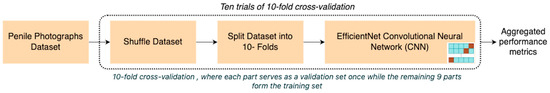 We performed ten trials of 10-fold internal cross-validation on the dataset of 136 images. The dataset was divided into ten folds, each containing penile SCC images and precancerous or benign images of penile lesions. Nine of the ten folds were used for training the CNN, while one fold was used for testing the algorithm. This process was repeated for ten rounds of validation, resulting in a total of 100 experiments.