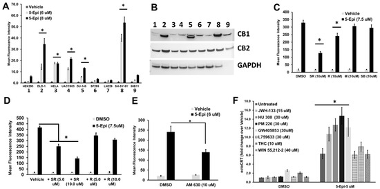 5-epi induced exposure of ectoCRT is partially mediated through CB2 agonism in CRC cells. (A) 5-epi dose dependently induced ectoCRT exposure in human CRC, cervical, melanoma, prostate, and neuroblastoma cell lines. Human glioblastoma and normal kidney epithelial, as well as normal rat cell lines did not significantly respond to 5-epi at the indicated concentrations. (* = p < 0.05; n = 3). (B) The relative expression levels of CB1 and CB2 were determined by Western blot analysis in the cell lines examined in (A). GAPDH was included as a loading control. The GAPDH antibody does not recognize the protein of rat origin. (C) 5-epi (7.5 µM) induced ectoCRT production was significantly attenuated by CB2 (SR; SR144528) and CB1 (R; SR141716) inverse agonists. (* = p < 0.05; n = 3) Antagonists of GPR55 (M; ML-193) and TRPV1 (SB; SB-705498) did not affect 5-epi-induced ectoCRT production. (D) Both SR and R dose dependently affected ectoCRT production. SR was more effective, implying a greater contribution of CB2 signaling to ectoCRT production. (* = p < 0.05; n = 3) (E) 5-epi induced ectoCRT exposure was significantly inhibited by a selective CB2 antagonist (AM 630). (* = p < 0.05; n = 3). (F) Among the CB2 agonists tested, only 5-epi (untreated) induced ectoCRT exposure in DLD-1 cells treated for 24 h. (* = p < 0.05; n = 3) JWH-133, HU-308, PM 226 and GW405853 enhanced 5-epi-induced ectoCRT production. (* = p < 0.05; n = 3), whereas L759633, THC, and WIN 55,212-2 had no effect on 5-epi-induced ectoCRT production.