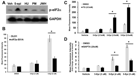 5-epi induces ER stress and ER Ca2+ depletion leading to ectoCRT exposure. (A) DLD-1 cells were treated with 5-epi and non-cytotoxic CBR agonists. ER stress was monitored by Western blot of phospho-eIF2α (Ser51). GAPDH was included as a loading control. (B) Expression of the dominant–negative eIF2αS51A mutant abrogates 5-epi induced ectoCRT exposure (n = 3). (C,D) EctoCRT exposure was determined after 24 h of treatment in the presence or absence of thapsigargin (C) and BAPTA-AM (D). (* = p < 0.05; n = 3).