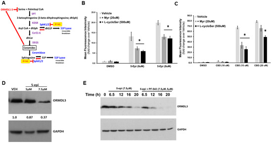 5-epi stimulates de novo synthesis of Cer through depletion of ORMDL3. (A) SPT activity, the first step in the de novo synthesis pathway, is regulated by a family of small, ER-resident, membrane-bound proteins, the orosomucoid-like proteins (ORMDL1-3). ORMDL proteins bind to and inhibit SPT activity. Importantly, Cer can bind to the ORDML proteins and enhance the interaction of ORMDL proteins with SPT. Thus, Cer acts as a feedback sensor to regulate levels of its own synthesis. (B) DLD-1 cells were treated with the indicated concentrations of 5-epi for 24 h in the presence and absence of the inhibitors of de novo Cer synthesis, myriocin (Myr), and L-cycloserine (L-cycloSer). EctoCRT production was determined by flow cytometry. (n = 3). (C) DLD-1 cells were treated with the indicated concentrations of CBD for 24 h in the presence and absence of the inhibitors of de novo Cer synthesis, myriocin (Myr) and L-cycloserine (L-cycloSer). EctoCRT production was determined by flow cytometry. (n = 3). (D) DLD-1 cells were treated with the indicated concentrations of 5-epi for 24 h. Levels of ORMDL3 and GAPDH were determined by Western blot analysis. (n = 3). (E) DLD-1 cells were treated with the indicated concentrations of 5-epi in the presence or absence of PF-543 at various time points. Levels of ORMDL3 and GAPDH were determined by Western blot analysis on separate blots. (n = 3) (* = p < 0.05).