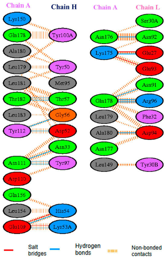 Further, the PDBsum database was used to generate comprehensive interaction maps, emphasizing crucial residues involved in binding. As shown in Figure 1, the protein’s heavy chain (chain H), namely residues from Tyr50 to Thr57, which include the non-standard residue Lys53A, were found to have substantial interactions with HER2. The residues involved in the contact were Tyr50, Ile51, Asp52, Pro53, Lys53A, His54, Gly55, Gly56, and Thr57. There were a total of nine essential residues for this interaction. Similarly, the light chain (L chain) consisted of six crucial residues, namely Asn91, Asn92, Glu93, Asp94, Leu95, and Arg96. Earlier work in this domain demonstrated that these regions play a crucial role in the high-affinity binding seen in the antibody–HER2 complex. The heavy chain residues Lys53A and His54 formed H-bonds with Glu109 and the residues Asn33 and Tyr97 formed H-bonds with Asn111; moreover, Asp52 and Gly56 formed H-bonds with Tyr112, and lastly, Thr57 formed a H-bond with Thr182A. Further, the light-chain residues Asn92, Glu27, and Asp94 created H-bonds with Asn176, Lys175, and Ala180, respectively; similarly, Asn91 and Arg96 also formed H-bonds with Gln178. The PDBsum analysis showed a consistent pattern of preserved interactions, indicating potential binding sites for peptides.