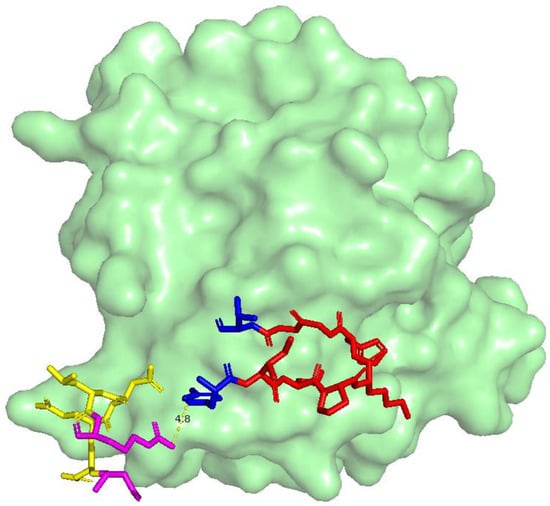 The 100 docking models for each of the 20 peptides, which were obtained from the HDOCK server, were examined for each peptide–protein complex. The use of FreeSASA was crucial in determining the precise measurement of the protein’s surface area that was buried upon peptide binding. This measurement acted as a reliable indicator of the robustness and durability of the interaction. The most suitable model for each peptide–protein complex could be discovered by calculating the delta SASA, which represented the difference in the surface accessibility between the bound and unbound states. The model with significant decrease in surface accessibility indicated the strongest and most stable binding association. The selected models, characterized by the largest delta SASA, were the most promising candidates. The best docking model from each of the 100 peptides is listed in Table 3, along with the bound and unbound SASA values and the change in the surface area when the peptide is bound. The delta SASA represents the difference between the bound and unbound SASA at the binding site, indicating the extent of surface area buried upon peptide binding. A higher delta SASA suggests a stronger and more stable interaction between the peptide and the target protein, making these models the most promising candidates for further analysis and therapeutic development. The bound and unbound state of the best model of peptide 1 is given in Figure 3. Figure 3a shows the binding site of the protein in magenta, illustrating the region that is available for potential interaction with a peptide. This represents the state of the protein before any peptide has bound, showing the unoccupied binding site in its natural form. In Figure 3b, the protein is shown after the docking process, where peptide 1 (depicted in yellow) has successfully bound to the protein. The peptide is now positioned over the binding site, effectively covering it. This demonstrates the interaction between the peptide and the protein, showing how the peptide occupies and interacts with the specific binding site.