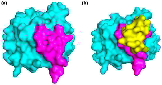 (a) A surface representation of the protein (cyan) highlighting the binding site (magenta) prior to docking. (b) A surface representation of the protein after docking, showing peptide 1 with best model (model_15) (yellow) bound to the protein, occupying and covering the binding site.