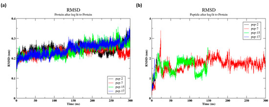 RMSD trajectories for the protein and peptides for the 300 ns simulation (a) The RMSD of the protein and (b) the RMSD of the peptides.