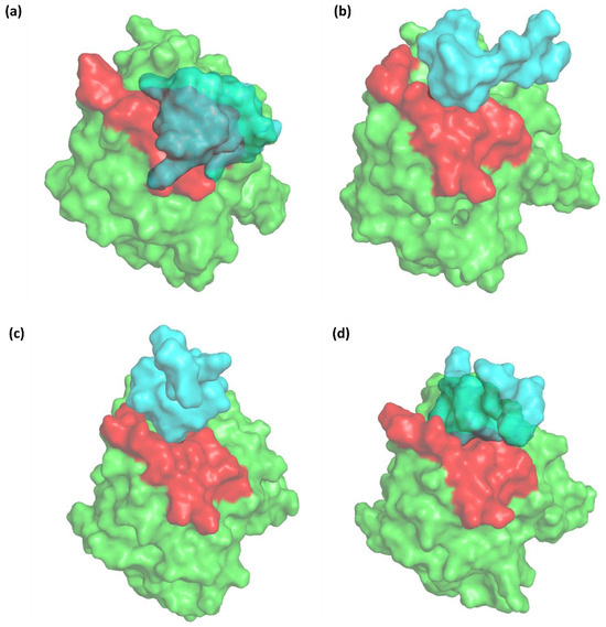 Conformational changes in the protein–peptide complex at different time points during molecular dynamics simulation: (a) 0 ns, (b) 100 ns, (c) 200 ns, and (d) 300 ns. The protein is shown in green, the binding site in red, and the peptide in cyan.