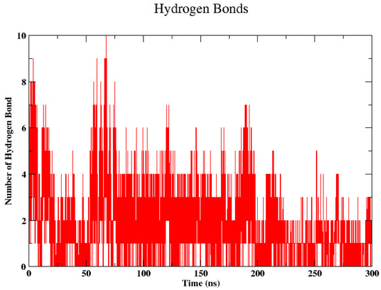 The formation of hydrogen bonds (H-bonds) between proteins and ligands plays a crucial role in stabilizing their interactions. These chemical bonds play a critical role in ensuring ligand recognition and complex stability by providing specificity and binding affinity and inducing conformational changes. Figure 8 shows fluctuations in the number of hydrogen bonds, which ranged from zero to ten, over a time span of 300 nanoseconds. Initially, the number of hydrogen bonds peaked at around eight then decreased and fluctuated between two and six for the majority of the timeline, with occasional spikes reaching up to eight bonds. The density of the bonds indicated more frequent changes in the number of hydrogen bonds in certain periods, particularly in the first 100 nanoseconds, after which the frequency of changes seemed to decrease, becoming more sporadic as time progressed.