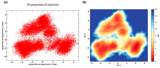 Figure 9a shows the principal component analysis (PCA). The plot reveals three distinct clusters of points, indicating that the system sampled three major conformational states during the simulation. The spread and density of the points within each cluster suggest varying degrees of flexibility or stability in these conformational states. Transitions between these states are visible as points connecting the clusters, indicating occasional shifts from one state to another. This type of PCA is useful for understanding the dominant motions in the system and identifying the key conformational changes that occur over the course of the simulation. Similarly, Figure 9b shows the free energy landscape (FEL). The color gradient, ranging from red (low free energy) to blue (high free energy), illustrates the relative stability of the different conformational states of the system. The red regions indicate the most stable conformational states, characterized by the lowest free energy, while the blue regions correspond to higher-energy, less stable states.