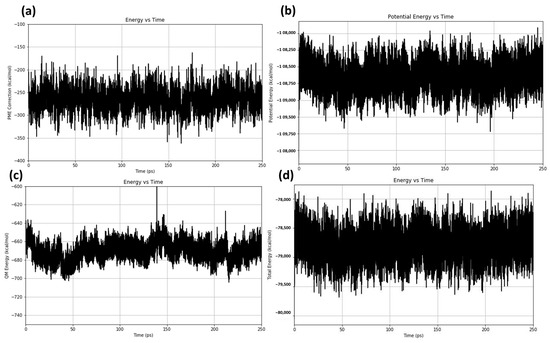 The particle-mesh Ewald (PME) correction energy fluctuations across the simulation time are plotted in Figure 11a. The long-range electrostatic interactions computed using the PME approach exhibited fluctuation, as evidenced by the PME correction energy fluctuating between roughly −400 and −150 kcal/mol. This indicated dynamic changes in electrostatic interactions as the system equilibrated and is common in QM/MM simulations. The PME correction was stable and contributed to a constant electrostatic environment, as evidenced by the steady fluctuation with few deviations. Potential energy fluctuations during the simulation are plotted in Figure 11b, which shows that the system’s potential energy was stable. The potential energy fluctuated within a comparatively small range, staying constant at about −108,000 kcal/mol. This potential energy stability indicates that there were not any significant structural changes or destabilizing processes during the simulation, indicating that the protein–peptide complex was in a stable configuration. Figure 11c displays the quantum mechanics (QM) energy profile, which sheds light on the QM contributions to the protein–peptide interaction across time. Variations in the QM energy profile fell between −740 and −600 kcal/mol. The stable oscillation pattern indicates that the protein–peptide interaction’s quantum mechanical component stayed constant. This suggests that a stable association was supported by the fact that the electronic environment in the QM region was not changing significantly, which may include important components of the binding interface or catalytic residues. The protein–peptide complex’s total energy variations are plotted in Figure 11d, which illustrates the simulation’s overall energy stability. Overall stability in the protein–peptide complex was demonstrated by the total energy fluctuating around −79,000 kcal/mol. The overall energy consistency indicates that the QM and MM regions were interacting harmoniously, indicating that the parameters and QM/MM partitioning used successfully preserved a balanced simulation free from disruptive energy spikes. Overall, the protein–peptide combination was shown to be stable across the simulation time (250 ps) by the energy profiles across the PME correction, potential, QM, and total energy. This stability indicates that the complex was well-equilibrated, and the protein–peptide interactions were realistically represented by the QM/MM set up. The lack of significant energy fluctuations indicates that the complex did not undergo substantial conformational or electronic alterations, rendering this configuration appropriate for examining intricate interactions within the binding site and for subsequent drug design.